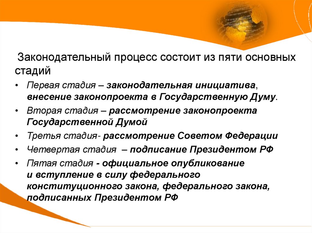 Законодательный процесс состоит из пяти основныхстадий