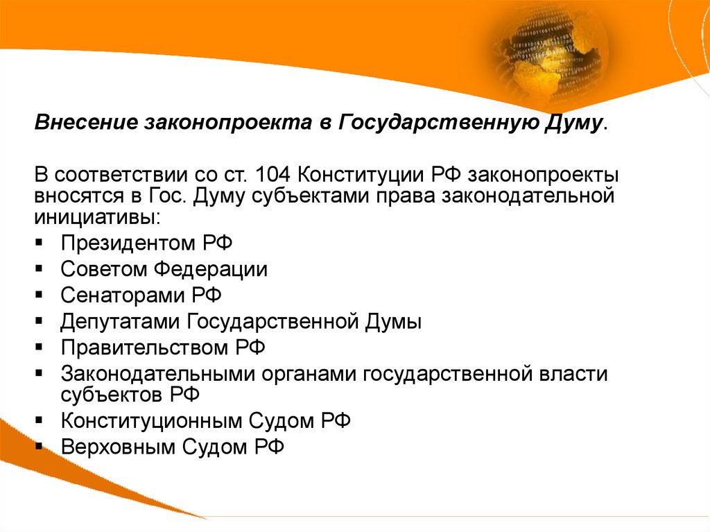 Внесение законопроекта в Государственную Думу.В соответствии со ст. 104 Конституции РФ законопроекты