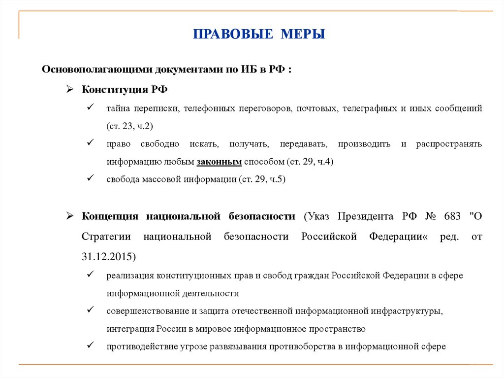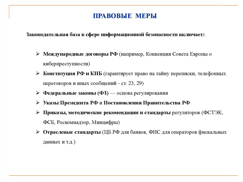ПРАВОВЫЕ МЕРЫЗаконодательная база в сфере информационной безопасности включает: