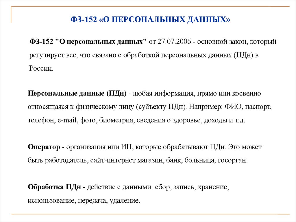 ФЗ-152 «О ПЕРСОНАЛЬНЫХ ДАННЫХ»ФЗ-152 "О персональных данных" от 27.07.2006 - основной закон, который