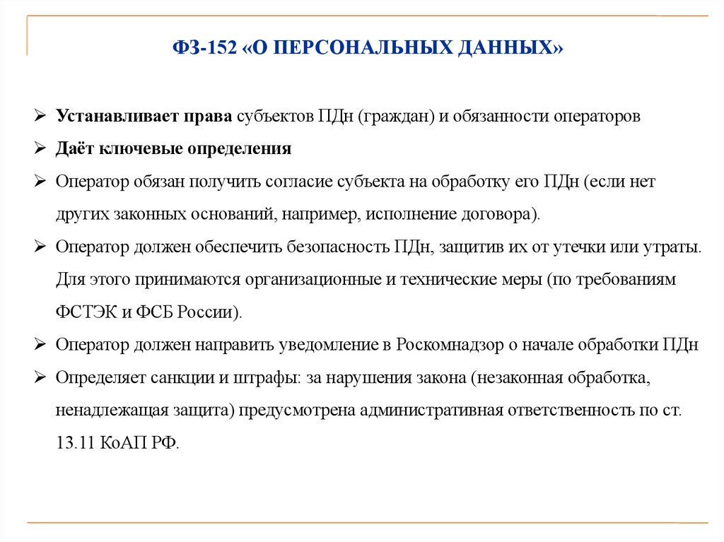 ФЗ-152 «О ПЕРСОНАЛЬНЫХ ДАННЫХ»Устанавливает права субъектов ПДн (граждан) и обязанности операторов