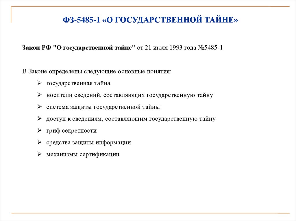 ФЗ-5485-1 «О ГОСУДАРСТВЕННОЙ ТАЙНЕ»Закон РФ "О государственной тайне" от 21 июля 1993 года №5485-1
