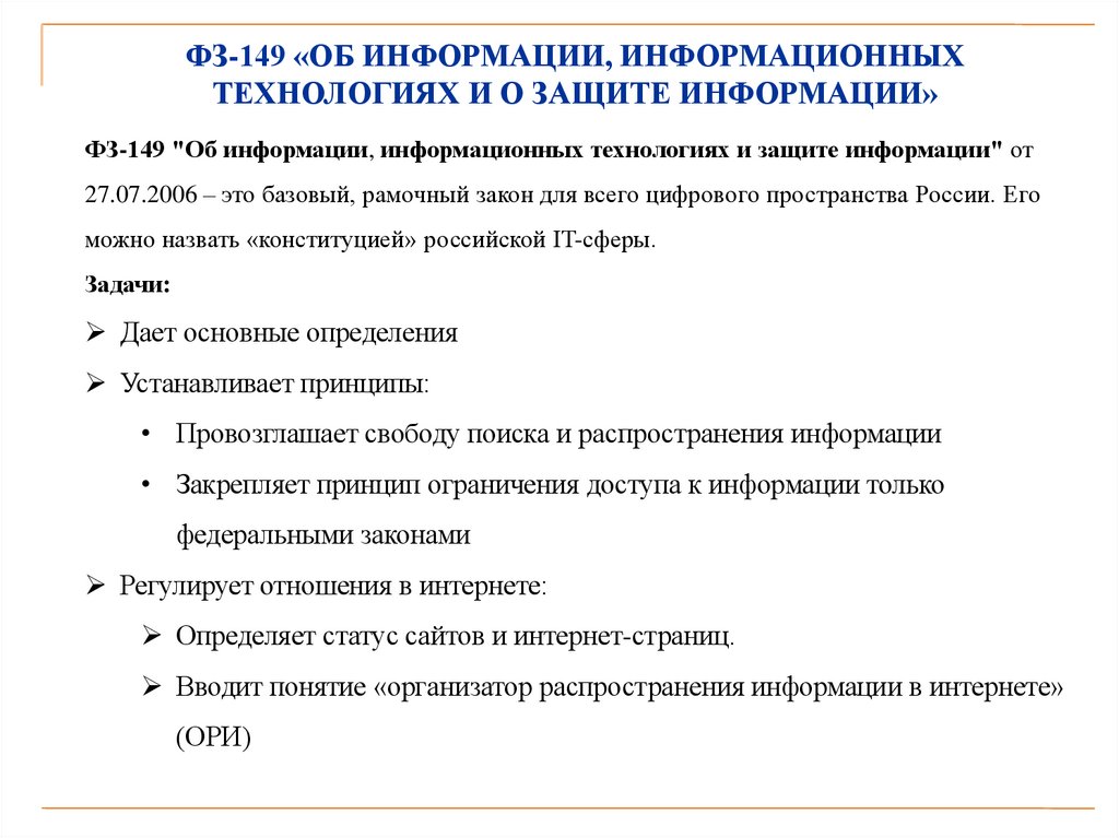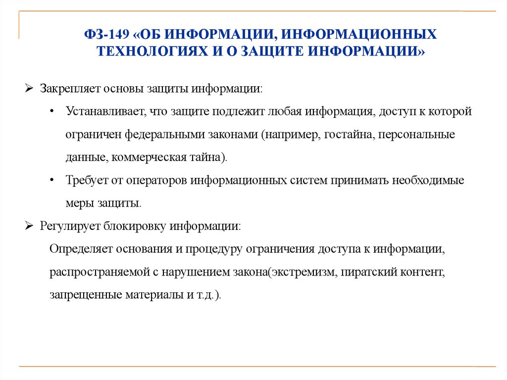 ФЗ-149 «ОБ ИНФОРМАЦИИ, ИНФОРМАЦИОННЫХТЕХНОЛОГИЯХ И О ЗАЩИТЕ ИНФОРМАЦИИ»