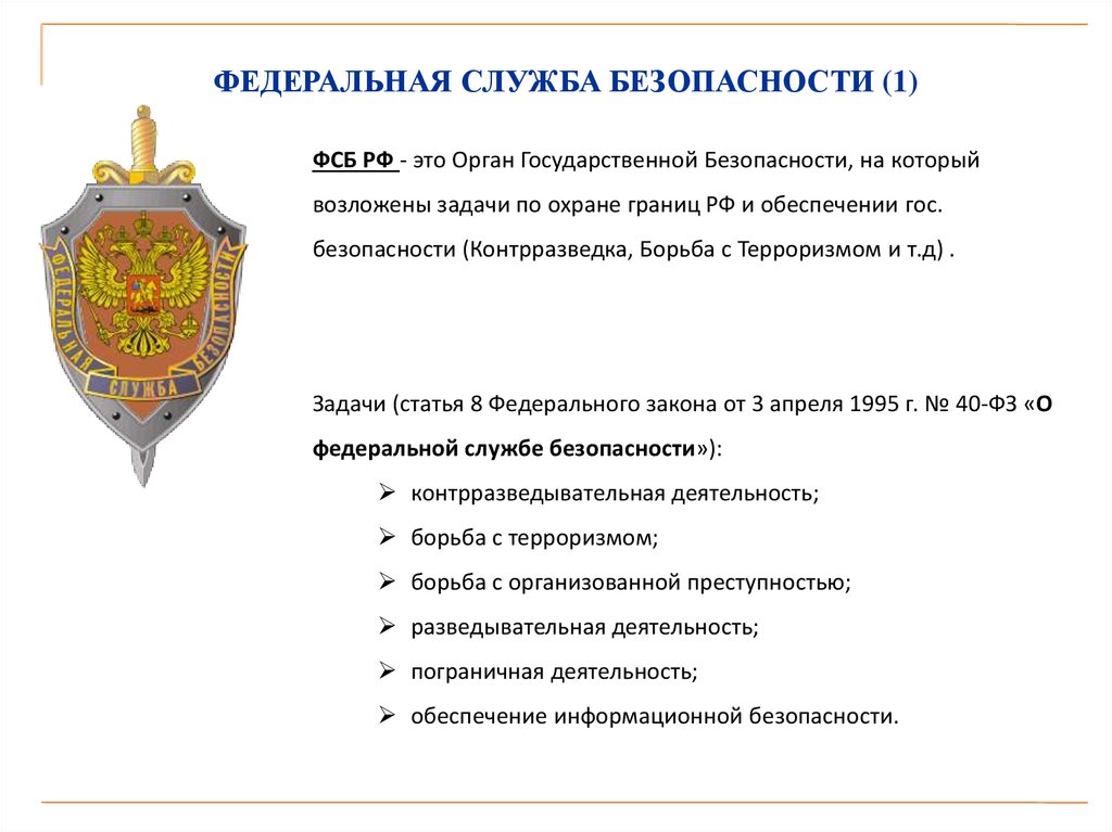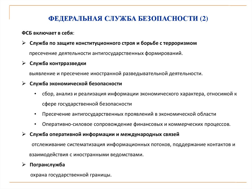 ФЕДЕРАЛЬНАЯ СЛУЖБА БЕЗОПАСНОСТИ (2)ФСБ включает в себя: