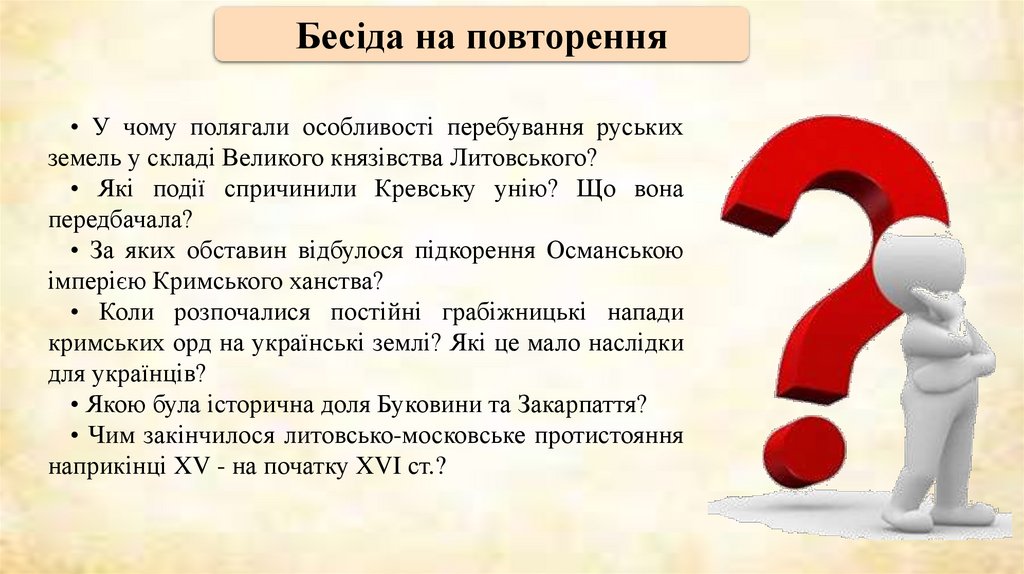 Бесіда на повторення• У чому полягали особливості перебування руських