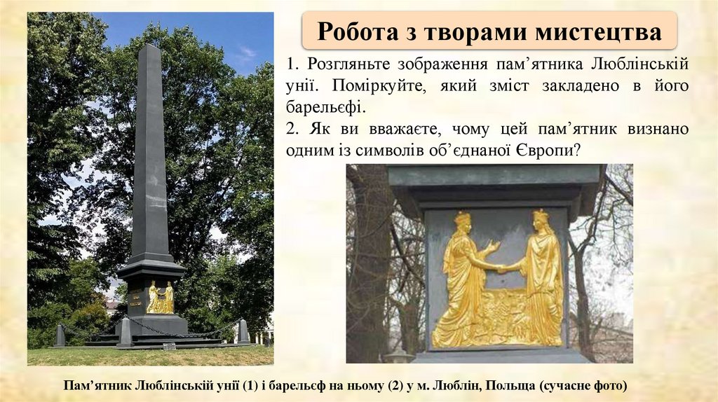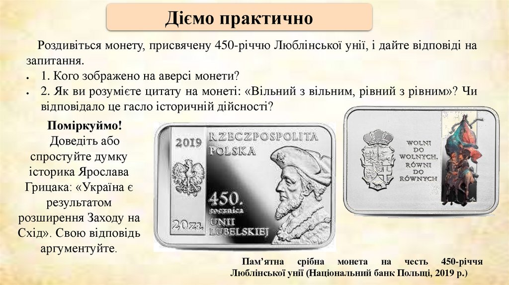 Діємо практичноРоздивіться монету, присвячену 450-річчю Люблінської унії, і дайте відповіді на
