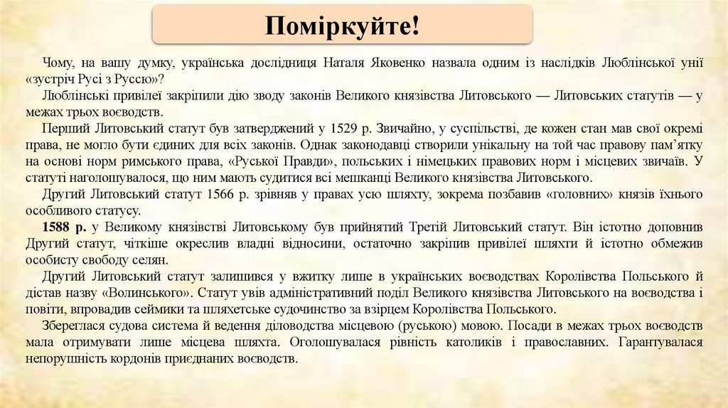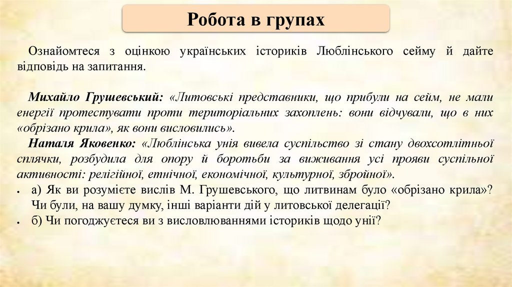 Робота в групахОзнайомтеся з оцінкою українських істориків Люблінського сейму й дайте