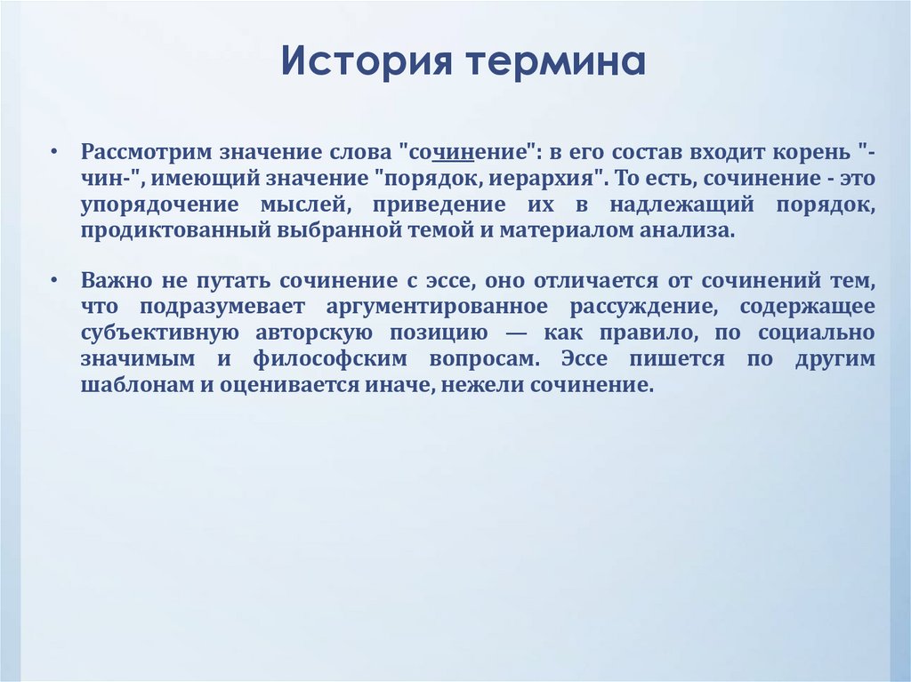 История термина• Рассмотрим значение слова "сочинение": в его состав входит корень "чин-", имеющий значение "порядок, иерархия". То есть, сочинение - это