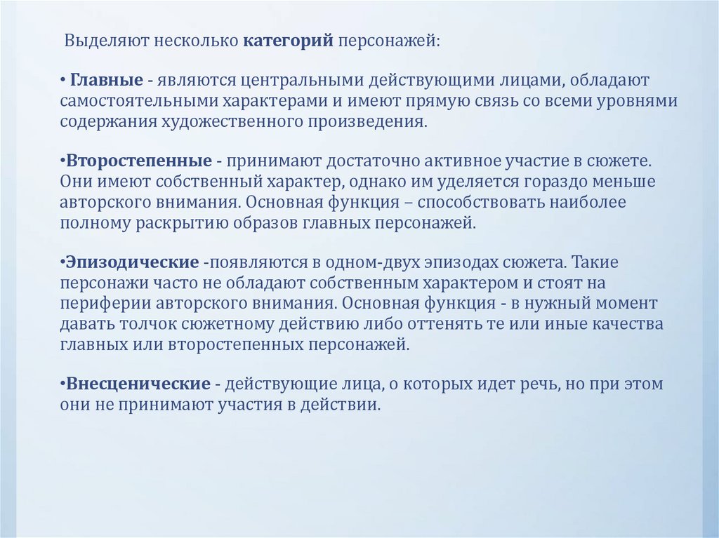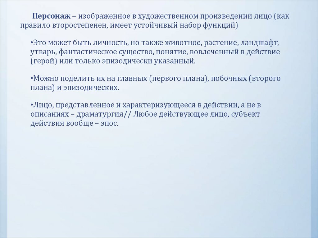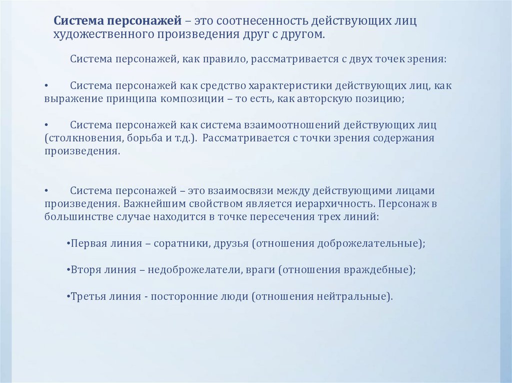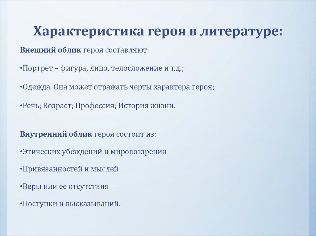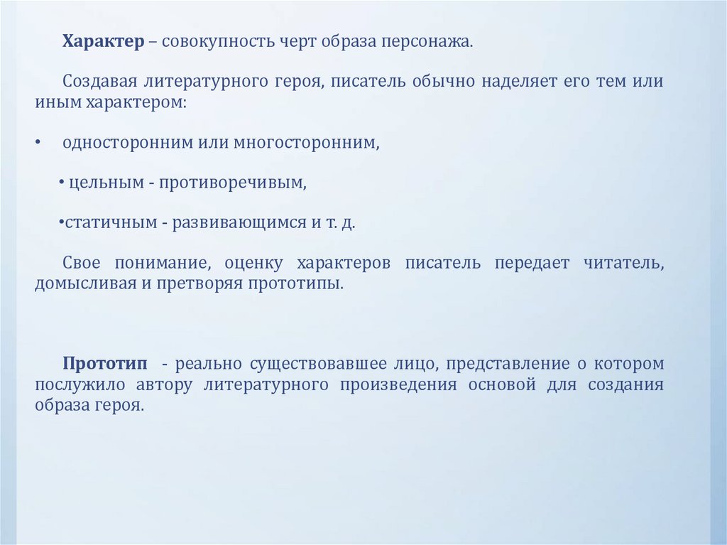 Характер – совокупность черт образа персонажа.Создавая литературного героя, писатель обычно наделяет его тем или