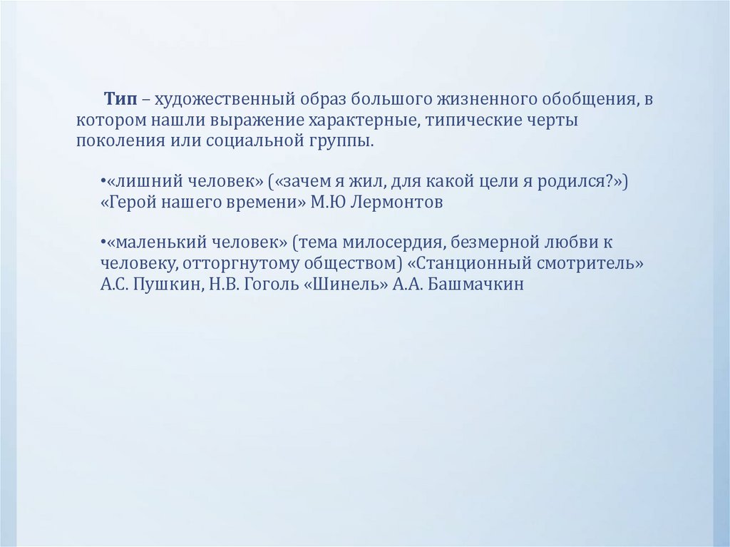 Тип – художественный образ большого жизненного обобщения, вкотором нашли выражение характерные, типические черты