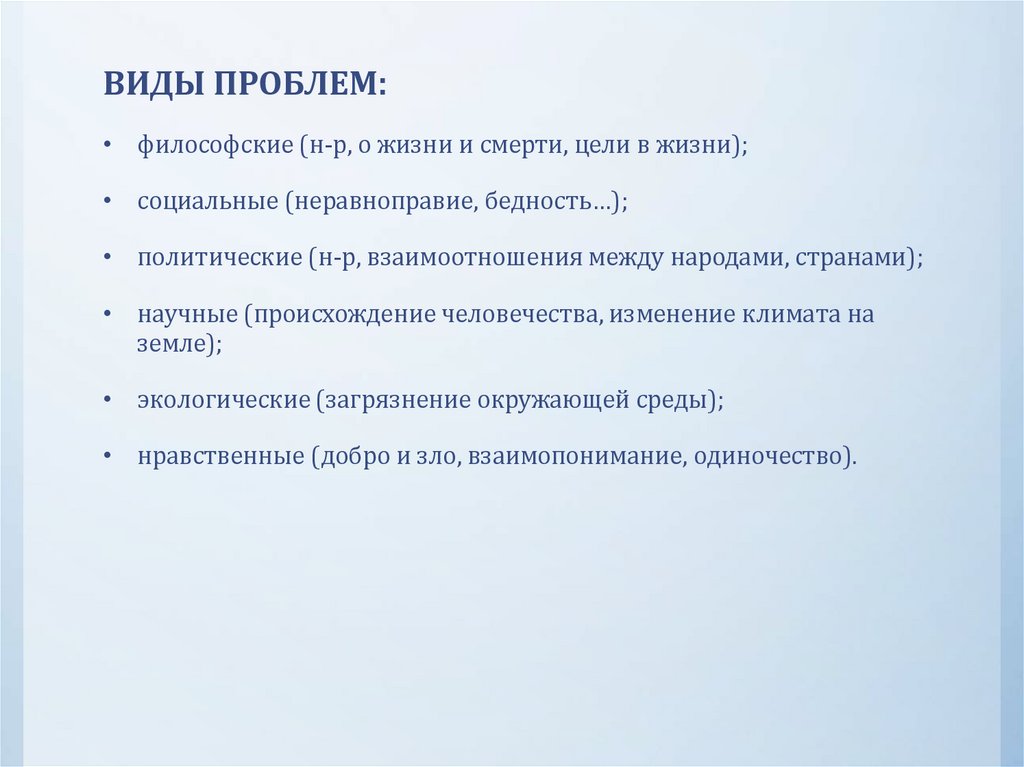 ВИДЫ ПРОБЛЕМ:• философские (н-р, о жизни и смерти, цели в жизни);