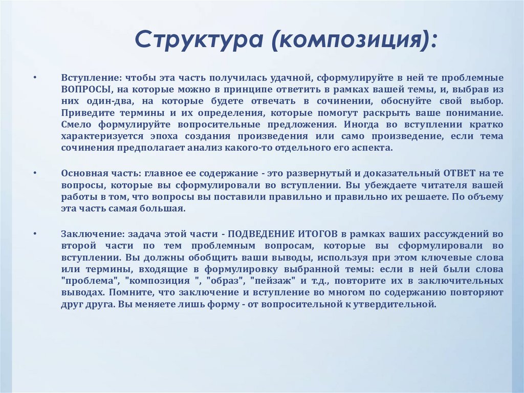 Структура (композиция):Вступление: чтобы эта часть получилась удачной, сформулируйте в ней те проблемные
