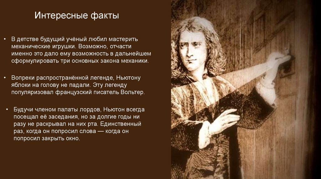 • Вопреки распространённой легенде, Ньютону