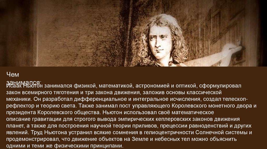 Ньютон занимался физикой, математикой, астрономией и оптикой, сформулировал