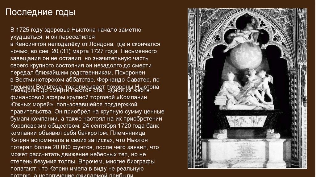 Последние годыВ 1725 году здоровье Ньютона начало заметно