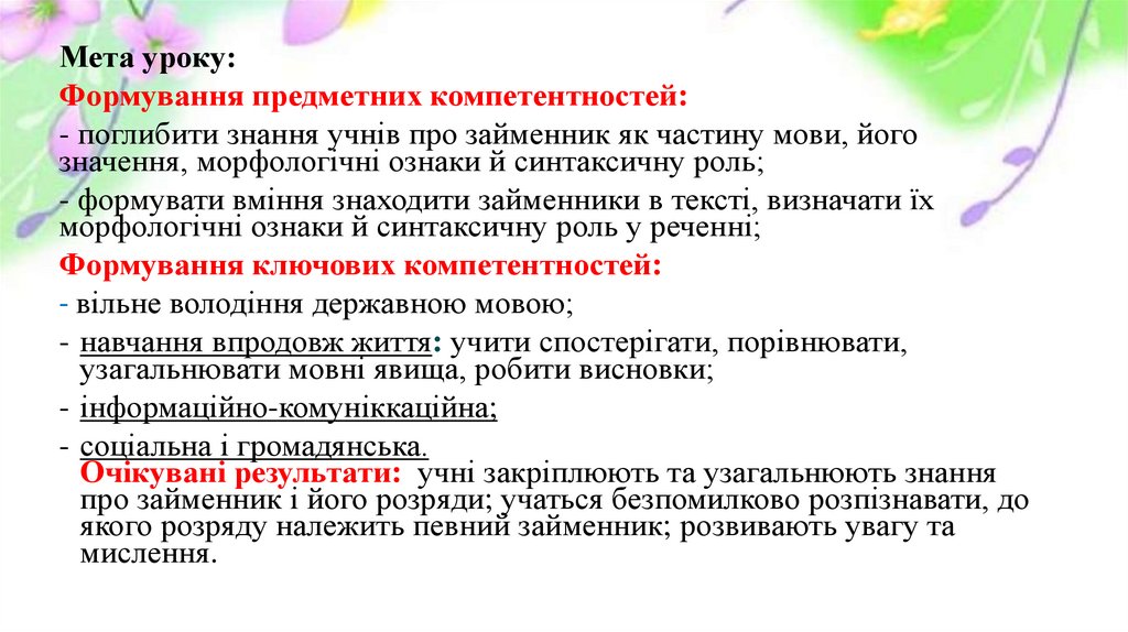 - формувати вміння знаходити займенники в тексті, визначати їх