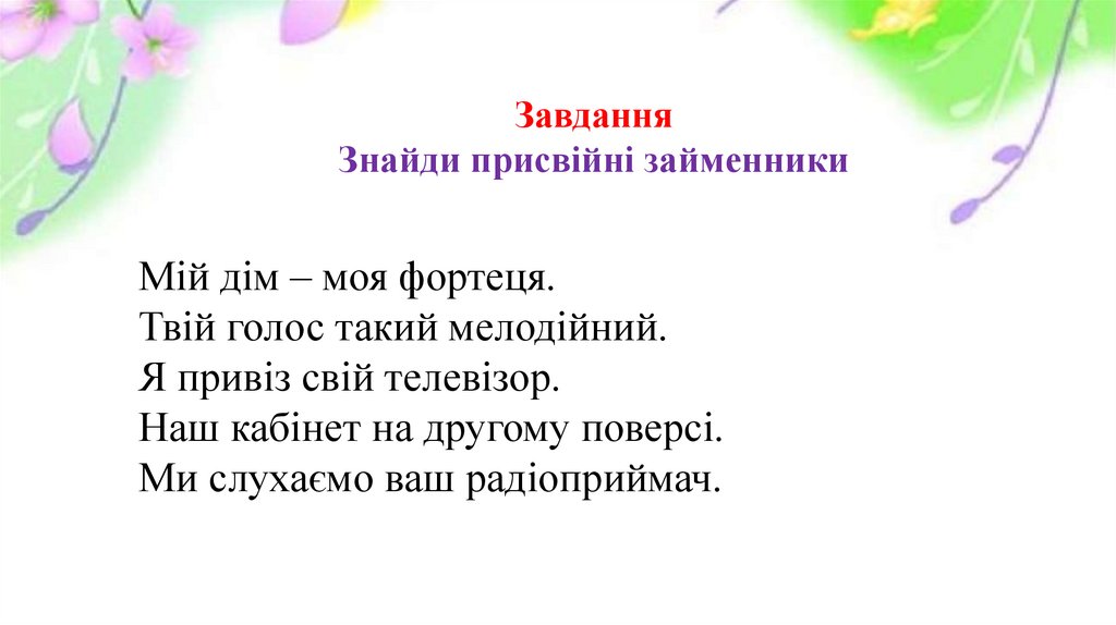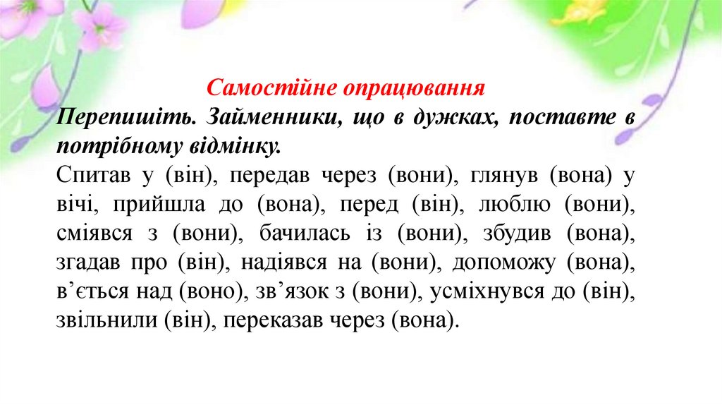 Самостійне опрацюванняПерепишіть. Займенники, що в дужках, поставте в