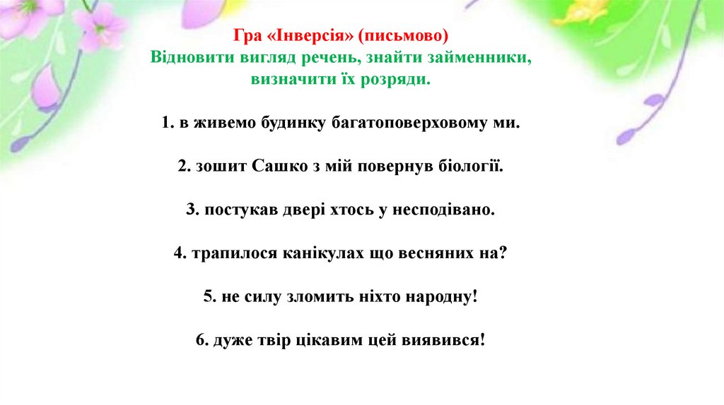 Гра «Інверсія» (письмово)Відновити вигляд речень, знайти займенники,