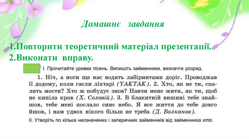 Домашнє завдання1.Повторити теоретичний матеріал презентації.