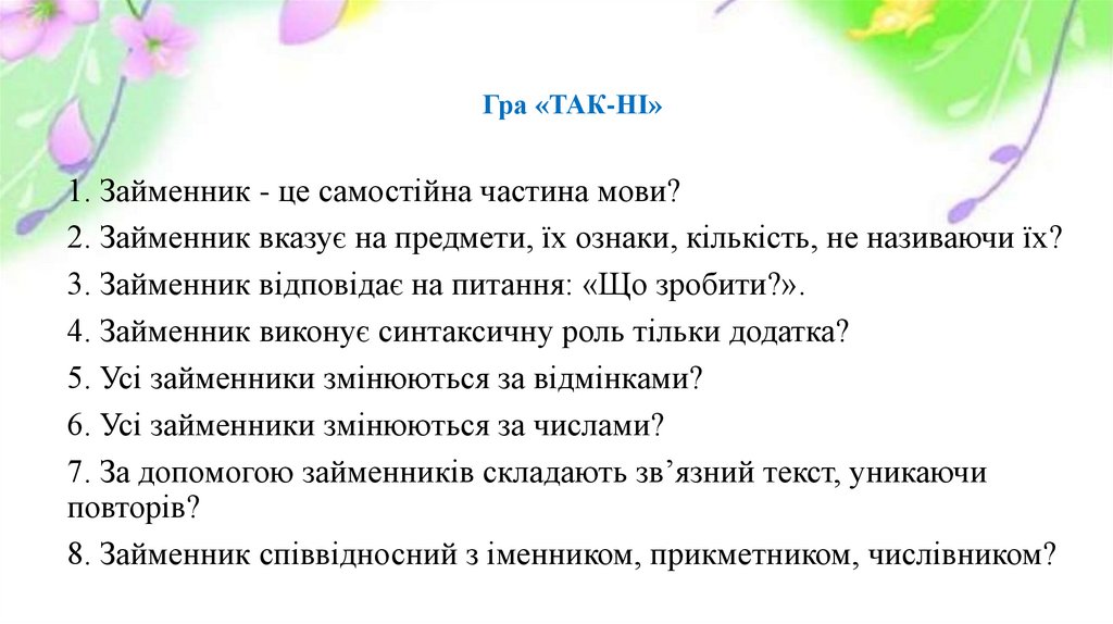 Гра «ТАК-НІ»1. Займенник - це самостійна частина мови?