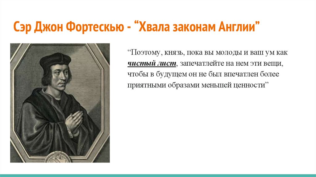 Сэр Джон Фортескью - “Хвала законам Англии”“Поэтому, князь, пока вы молоды и ваш ум как