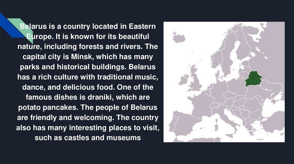 Belarus is a country located in EasternEurope. It is known for its beautiful