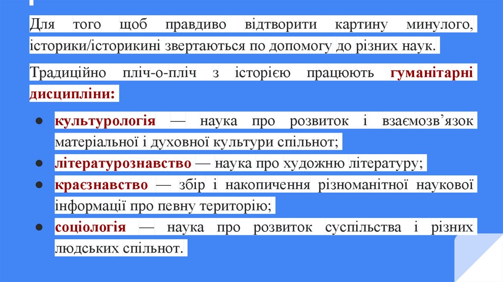 Для того щоб правдиво відтворити картину минулого,історики/історикині звертаються по допомогу до різних наук.