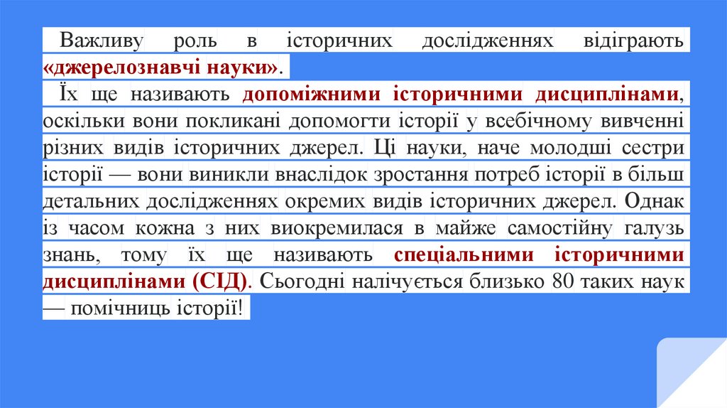 Важливу роль в історичних дослідженнях відіграють«джерелознавчі науки».