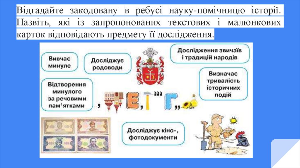 Відгадайте закодовану в ребусі науку-помічницю історії.Назвіть, які із запропонованих текстових і малюнкових