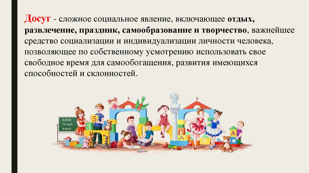 Досуг - сложное социальное явление, включающее отдых,развлечение, праздник, самообразование и творчество, важнейшее