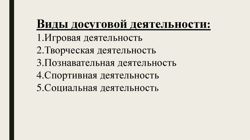 Виды досуговой деятельности:1.Игровая деятельность