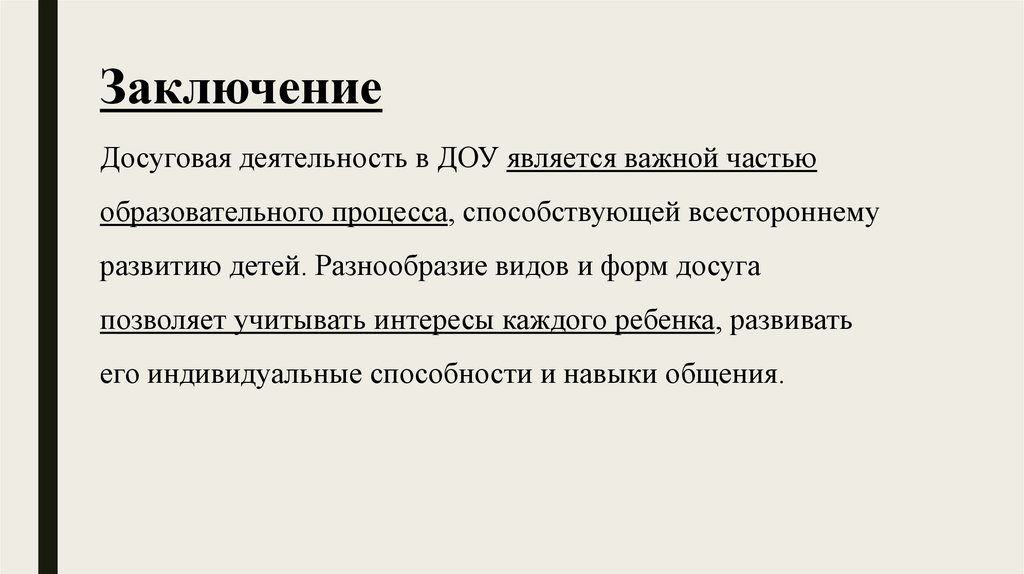 ЗаключениеДосуговая деятельность в ДОУ является важной частью