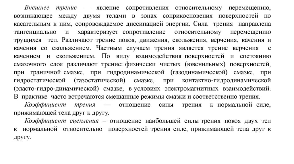 Внешнее трение — явление сопротивления относительному перемещению,возникающее между двумя телами в зонах соприкосновения поверхностей по
