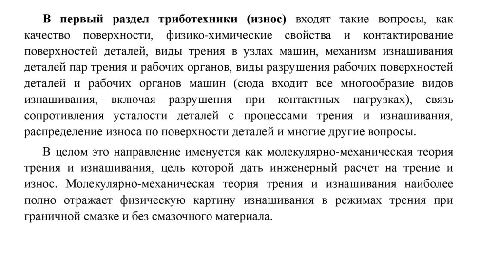 В первый раздел триботехники (износ) входят такие вопросы, каккачество поверхности, физико-химические свойства и контактирование