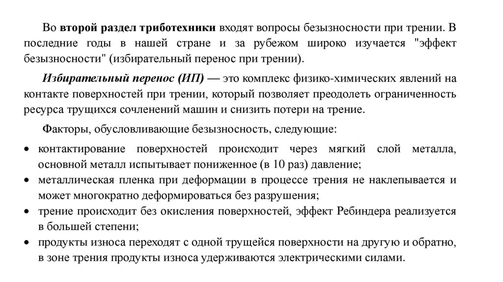 Во второй раздел триботехники входят вопросы безызносности при трении. Впоследние годы в нашей стране и за рубежом широко изучается "эффект