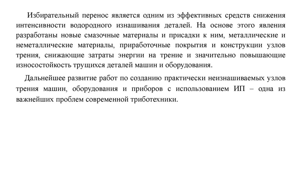 Избирательный перенос является одним из эффективных средств сниженияинтенсивности водородного изнашивания деталей. На основе этого явления