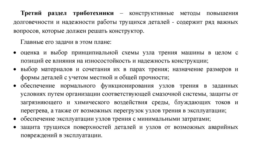Третий раздел триботехники – конструктивные методы повышениядолговечности и надежности работы трущихся деталей - содержит ряд важных