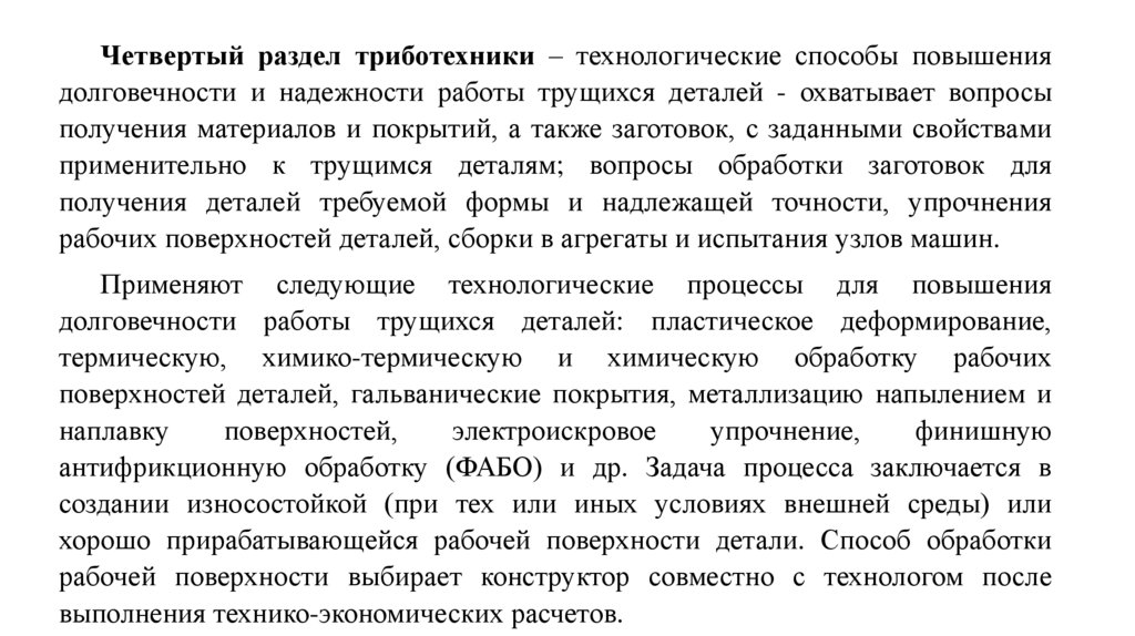 Четвертый раздел триботехники – технологические способы повышениядолговечности и надежности работы трущихся деталей - охватывает вопросы