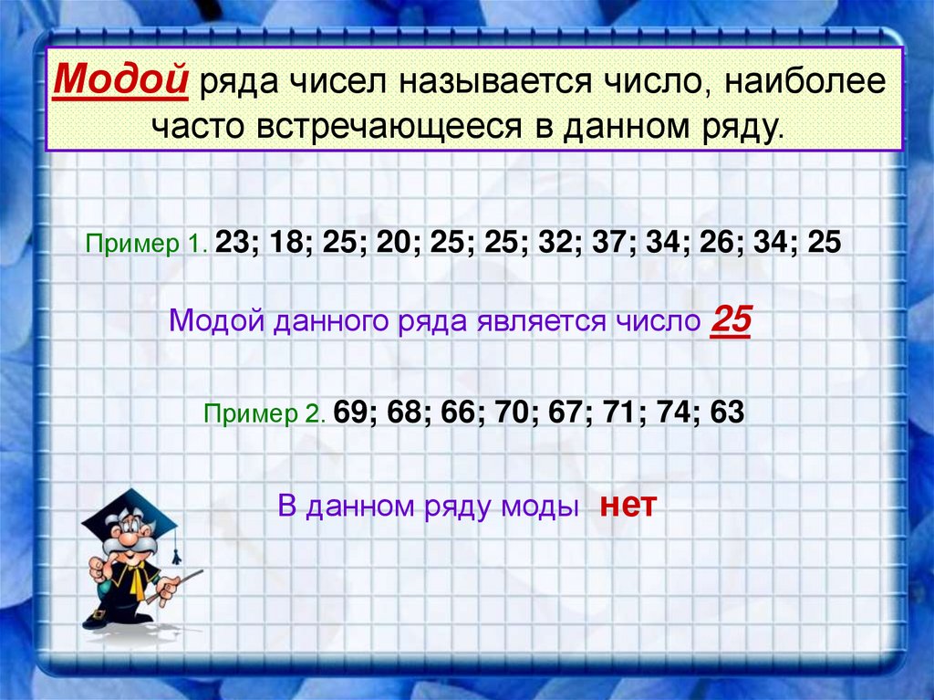 Модой ряда чисел называется число, наиболеечасто встречающееся в данном ряду.