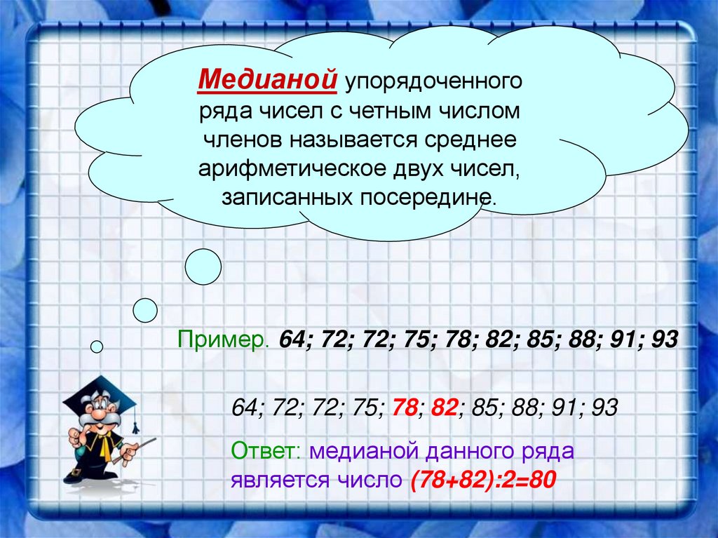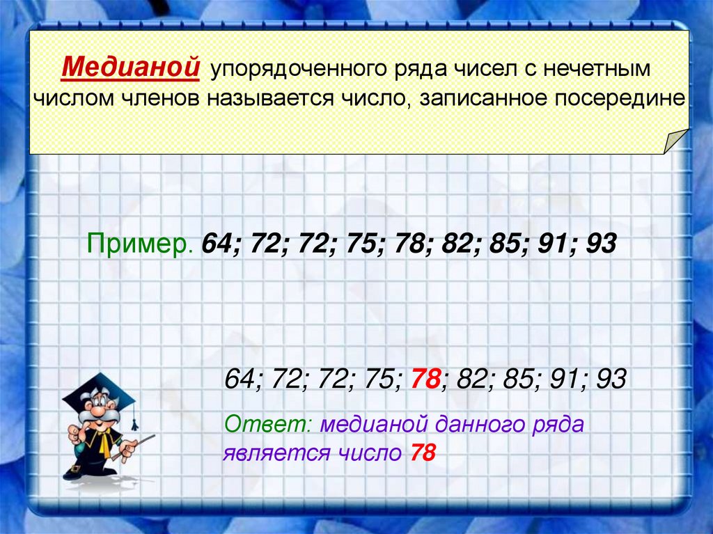 Медианой упорядоченного ряда чисел с нечетнымчислом членов называется число, записанное посередине