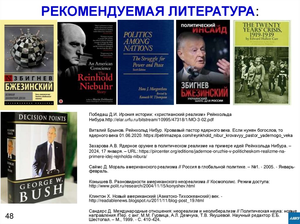 РЕКОМЕНДУЕМАЯ ЛИТЕРАТУРА:Победаш Д.И. Ирония истории: «христианский реализм» Рейнхольда