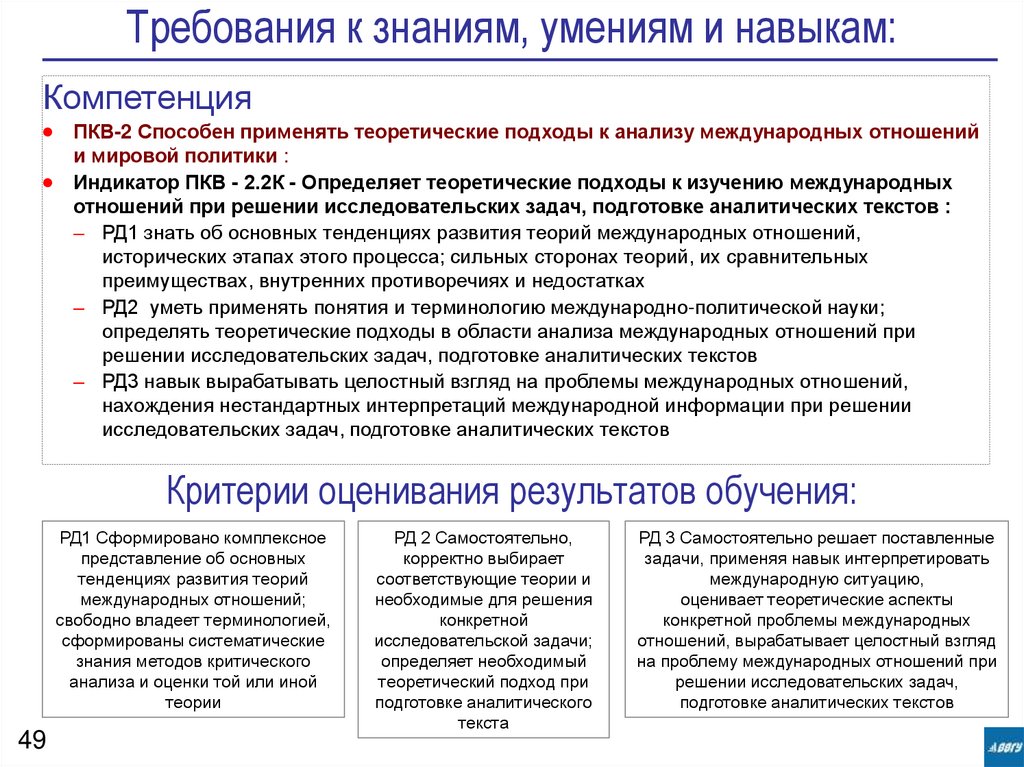 – РД1 знать об основных тенденциях развития теорий международных отношений,