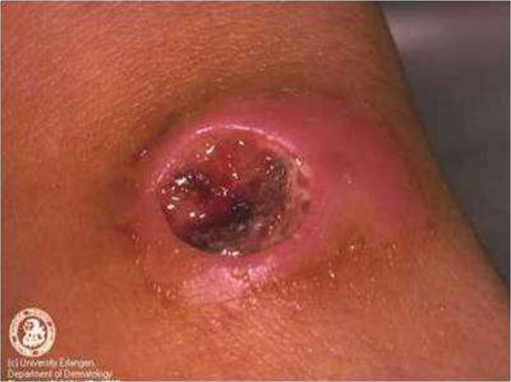 развивается пятно, папула, везикула, язва. По периферии язвочки развивается
