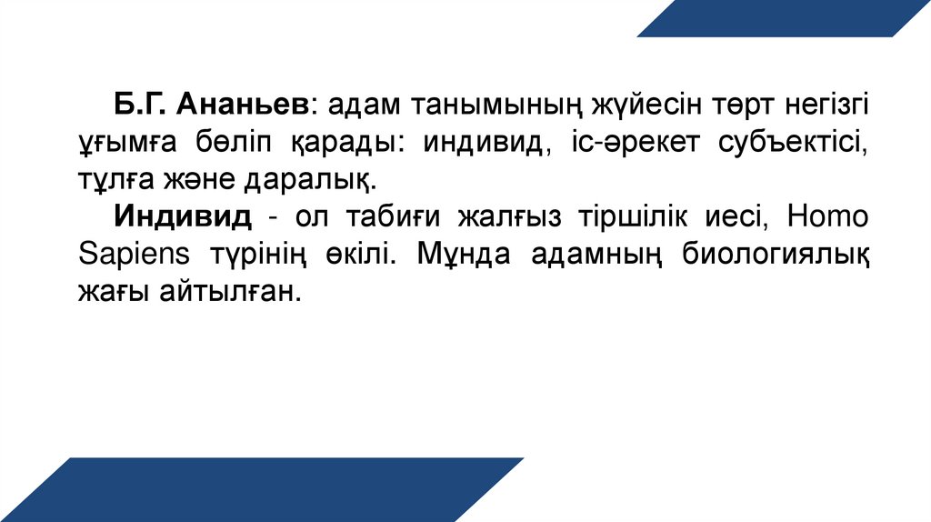 Б.Г. Ананьев: адам танымының жүйесін төрт негізгіұғымға бөліп қарады: индивид, іс-әрекет субъектісі,