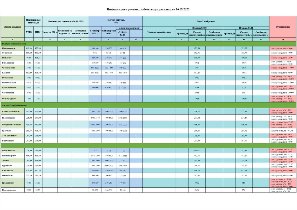 Информация о режимах работы водохранилищ на 26.09.2025Нормативные