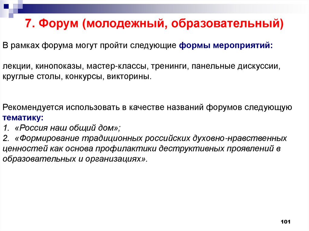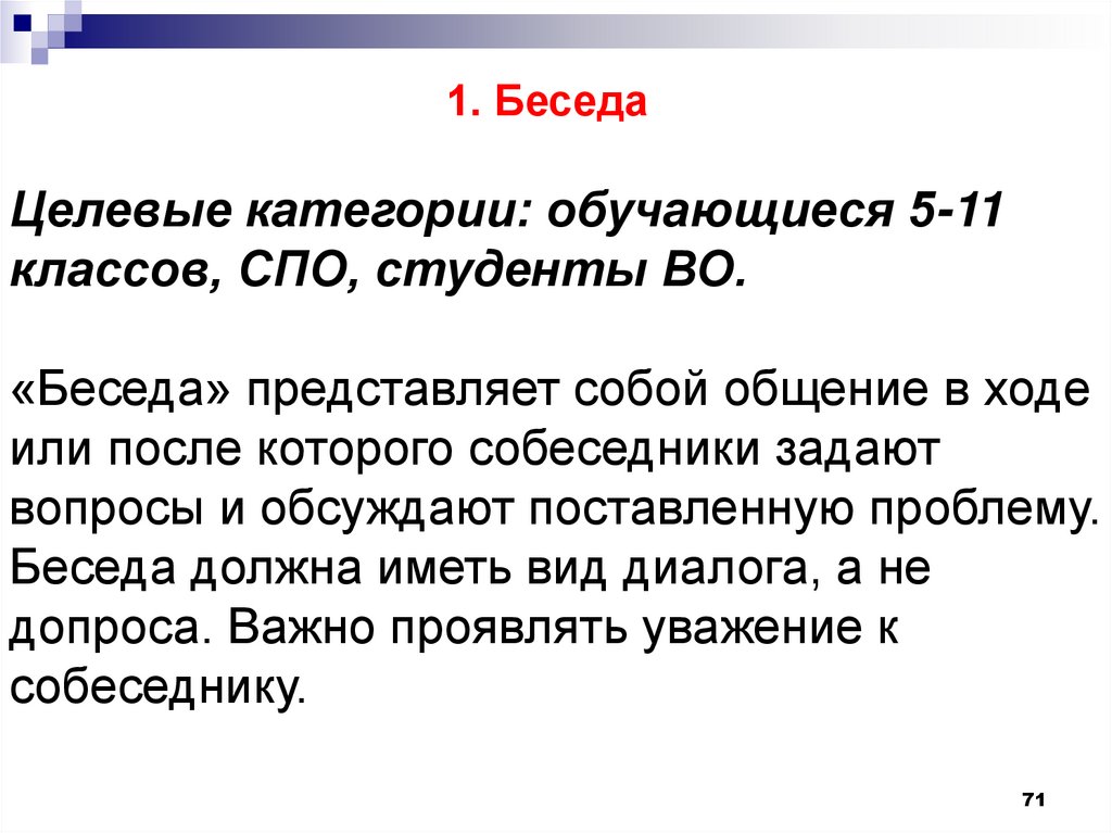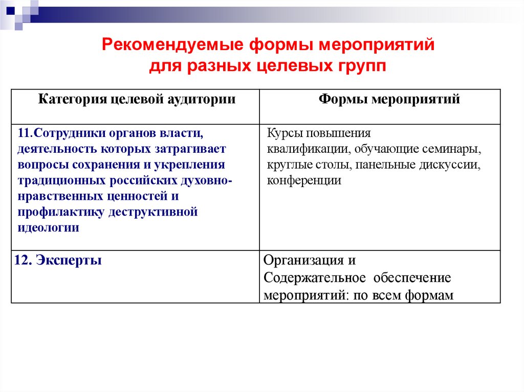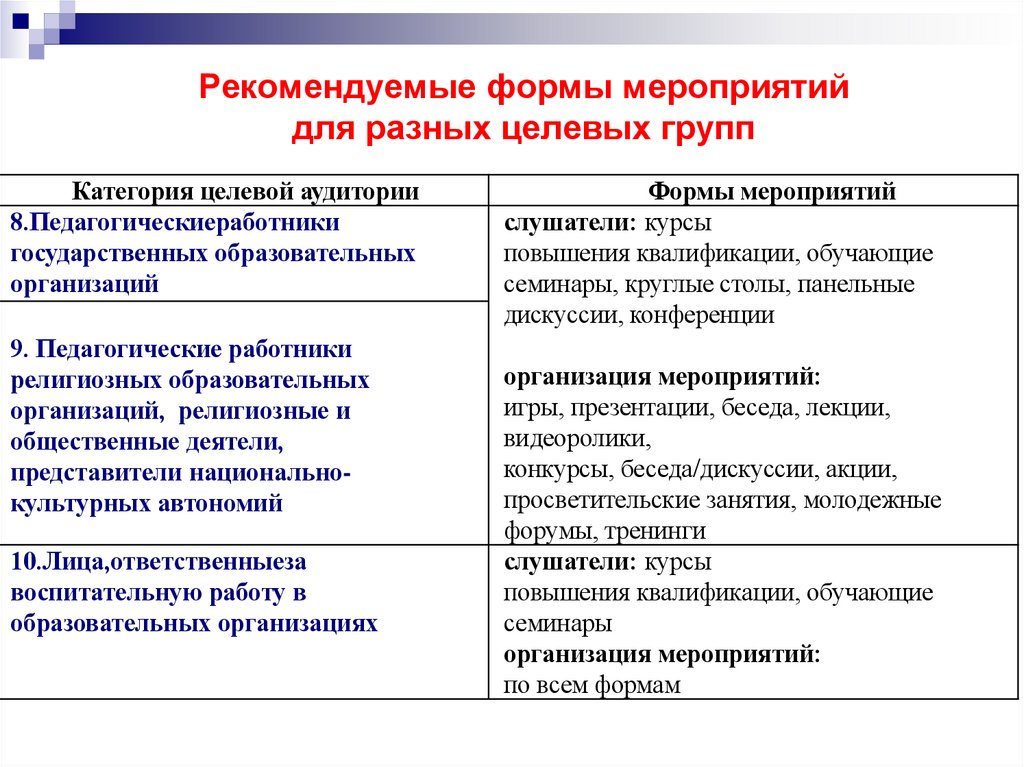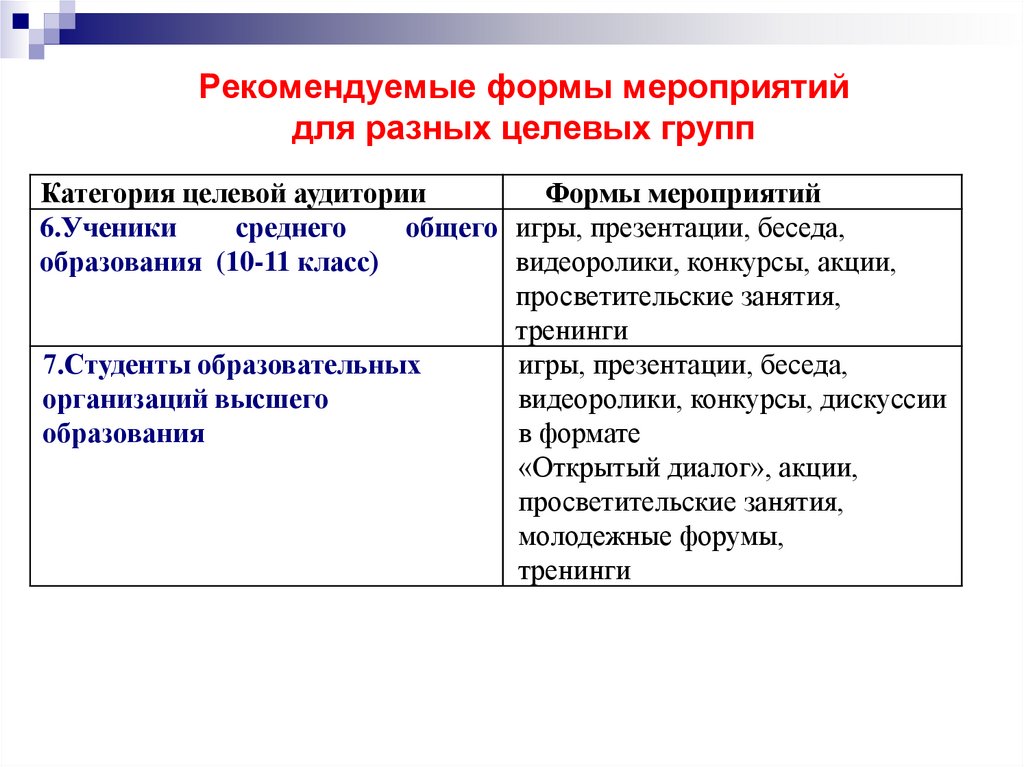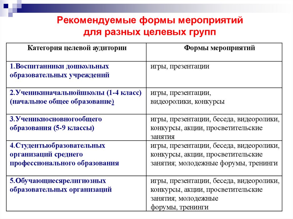 Рекомендуемые формы мероприятийдля разных целевых групп