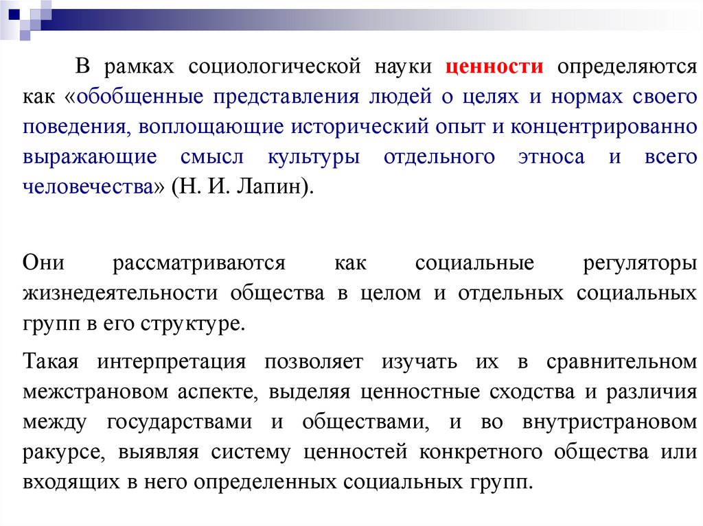 В рамках социологической науки ценности определяютсякак «обобщенные представления людей о целях и нормах своего
