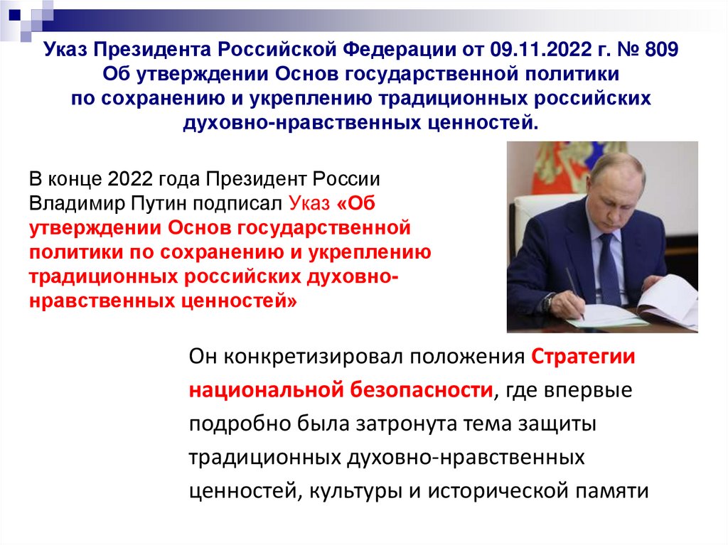 Указ Президента Российской Федерации от 09.11.2022 г. № 809Об утверждении Основ государственной политики