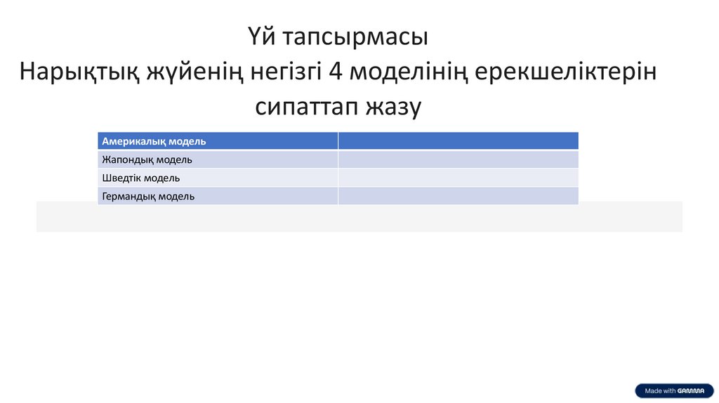 Үй тапсырмасыНарықтық жүйенің негізгі 4 моделінің ерекшеліктерін