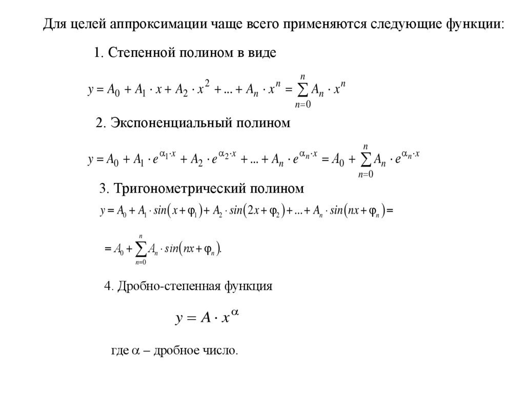 Для целей аппроксимации чаще всего применяются следующие функции:1. Степенной полином в виде